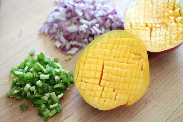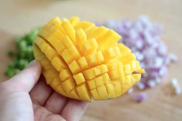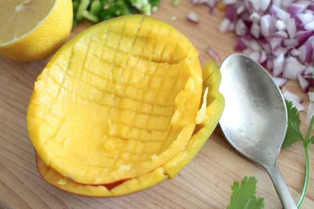 Para los mangos, cortar las mejillas de mango y corte el mango mientras está todavía en la piel como se muestra - conseguir como cerca de la piel como sea posible con la punta del cuchillo! Luego use una cuchara para sacar el mango cortado.