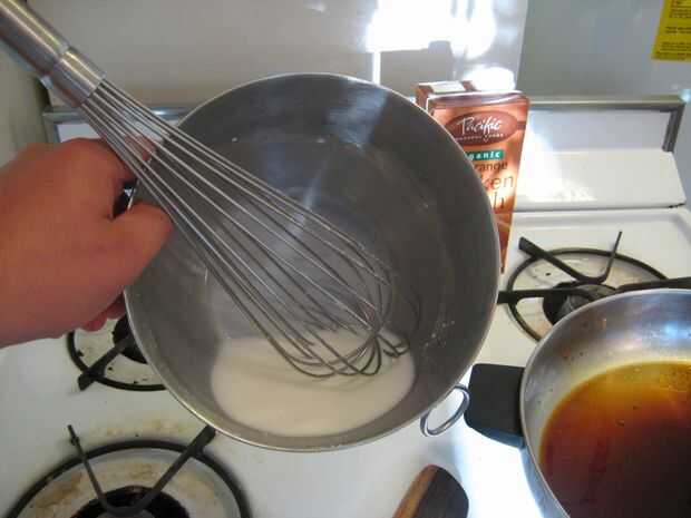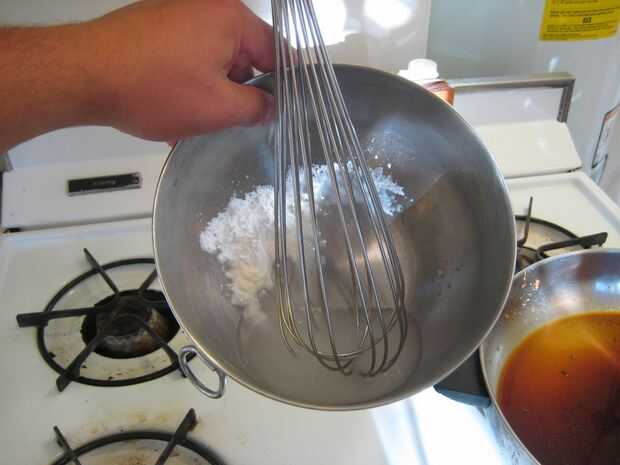 Mezclar aproximadamente una cucharada de harina de maíz con 1/2 taza de agua con hielo. Batirlo bien en un bol durante unos segundos hasta que quede un líquido incluso blanco. Probablemente estás preguntando a ti mismo, "esto no parece muy grueso, Noé ¿qué pasa?" Paciencia, paciencia, la maicena tiene que calentarse a más de 200 grados F antes de que espese.