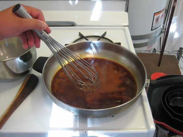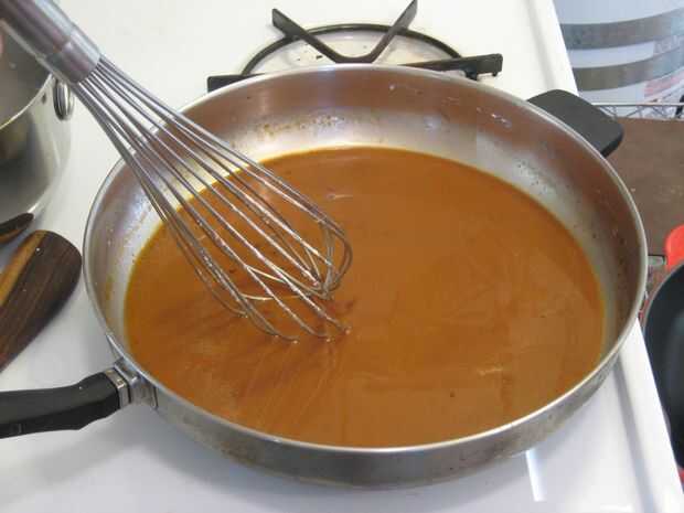 Mientras que revuelve, lentamente agregue el caldo y equilibrar la salsa con la mezcla de espesamiento hasta que tienes la cantidad de salsa que quieras, a la consistencia deseada. Realmente no son absolutos al realizar la salsa, pero esperar a añadir en la mayoría del espesante que has preparado si usted tiene alrededor de 1/2 taza en jugos y otra taza de caldo añadido. Si se desea espesar la salsa, no hay problema, sólo mezclar un poco más la mezcla y agregar poco a poco.