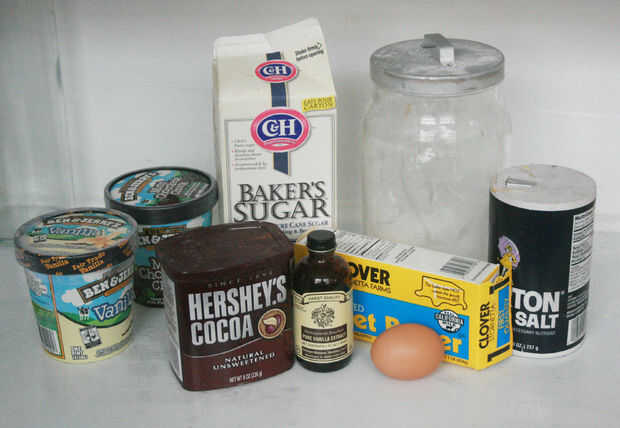 OK, ya estoy de regreso!  Aquí es una receta básica para tu pastel de sándwich de helado de chocolate.  Llenarlo con lo que tus deseos de corazón.  ¡ Seguir trabajando en el pastel de vainilla (receta del mismo, menos el cacao) y dejarle saber como me va!