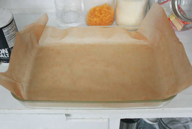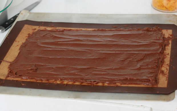 La primera vez que hice esto, usé papel de pergamino en una 10 x 15 pulgadas (25 x 38 cm) bandeja para hornear. La segunda vez, me deslizó una hoja de silicona (Sil-Pat) sobre una bandeja de galletas y simplemente extienda la mezcla en él con cuidado. Ambos métodos de trabajaban, pero prefiero la menor molestia de las galletas.