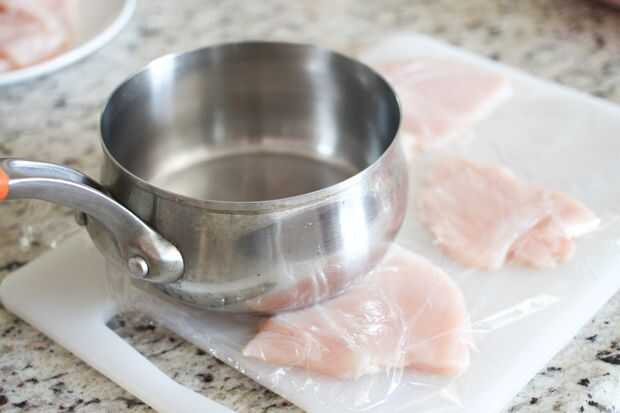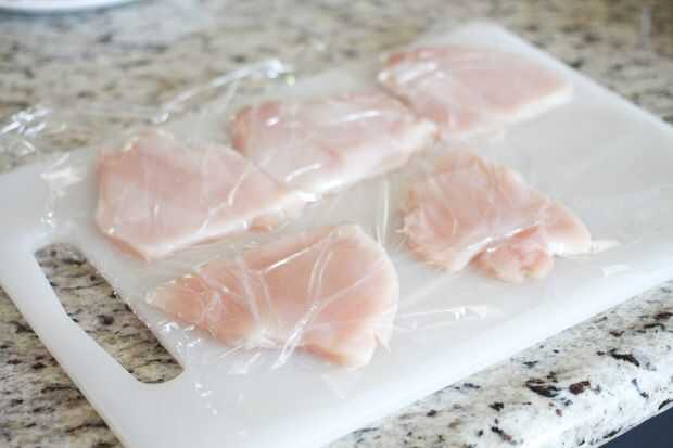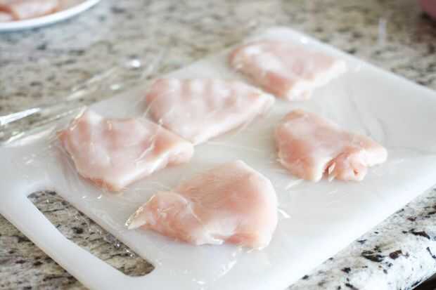 Coloque un pedazo de plástico sobre las pechugas de pollo cortadas y libra con una olla de fondo pesada.
