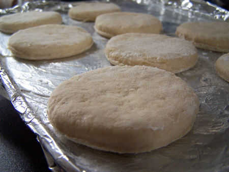 Añadir la sal y el azúcar. Mientras revolviendo, verter leche en - no debe ser demasiado pegajosa o demasiado seca. Agregar más leche o harina Si es necesario. Rápidamente puede amasar con las manos hacer una bola. Ahora espolvorear harina sobre una superficie plana y extienda a cerca de 1/2 pulgada (1,5 cm) grueso. Me corte mina usando un cristal - sólo la prensa a través de la masa. Poner en una bandeja de horno y hornear hasta que esté dorada en el estante superior - tardará unos 10-15 minutos.