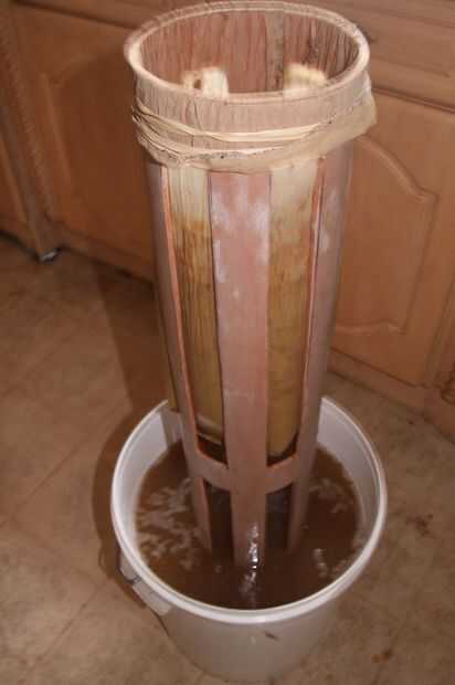 4. Vierta el zumo de manzana en un recipiente de plástico de 30 L y cucharada de la materia espumosa que se levanta a la tapa y deseche (ver foto). Una bolsa de filtro podría utilizar en este punto para eliminar la mayor parte del material grueso y aumentar el rendimiento un poco, pero no es esencial. Mi bolsa de filtro está sujeta a la parte superior de un 6" PVC suelo que ha sido ranurada hacia fuera con una sierra de calar (ver foto). Izquierda la mugre en la bolsa del filtro se llama 'Heces' y puede ser utilizado para hacer agradable manzana con sabor a pan o pasteles.