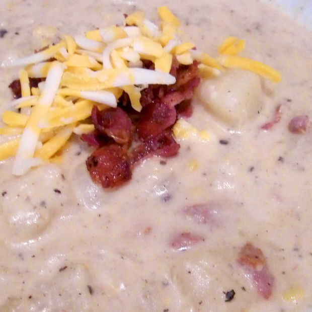 Después de unos minutos de la crema y el queso para conocer el resto de los ingredientes es hora de servir. Cucharada colmadas porciones en un recipiente, entonces cubra con más pedacitos de tocino y queso.