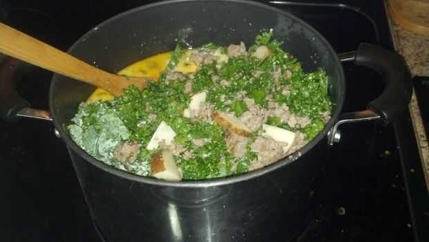 esta es una receta para sopa de Toscana Zuppa famosa y querida de Olive Garden. Más recetas de copy-cat he visto convocatoria de crema de leche. Esta versión utiliza la mitad y mitad, lo que es un poco más saludable.Ingredientes:1 libra de Salchicha