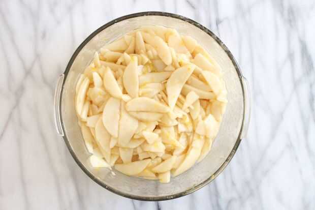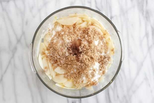 Todo lo demás - azúcar, vainilla, almidón de maíz, jengibre y sal - añadir en el bol y se mezcla todo junto suavemente con las manos. Probablemente algunas de las peras se rompen pero eso es bueno. Cuando se cocinan no será capaz de decir tanto. :)