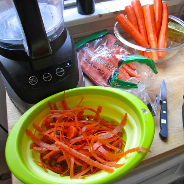 Si tienes un procesador de alimentos esto va super rápido! Me tomó unos cinco minutos para terminar la parte de la zanahoria. : D
