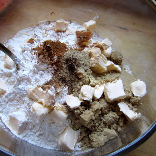 Cortar la mantequilla o margarina fría en cubos y cortarlo en la mantequilla. Puede utilizar un tenedor o un cortador de masa - lo que tienes.
