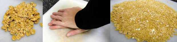 Molino de cereales con acción de rotación o mediante un perno de balanceo. Después de unos segundos el resultado debería verse como migajas de pan fino.