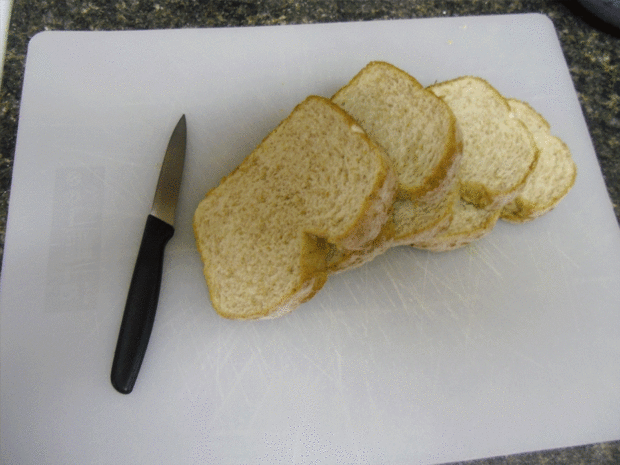 Con un cuchillo haga una incisión en la parte inferior de la rebanada de pan, creando un bolsillo dentro de la rebanada. Deje un buen perímetro entre el bolsillo y la corteza.