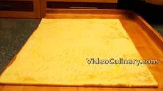 Hornear a 180° C durante 8-10 minutos, hasta que estén doradas de luz. Retirar del horno, enfriar un poco, invertir y pelar del papel pergamino. Enfríe por completo. Cortado en 6 partes iguales.
