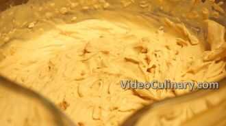 Sacar del frigorífico la mezcla de caramelo y coloque en el recipiente de una batidora. Añadir 500 ml de crema (min 30% grasa) y batir a velocidad alta hasta que esté espesa.