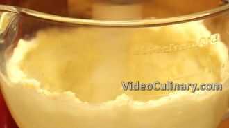 Hacer las capas de esponja de mantequilla: independiente 9 huevos. Lugar 150 gramos de mantequilla blanda, 100 gramos de azúcar, una pizca de sal y una cucharadita de azúcar de vainilla en el recipiente de una batidora. Batir hasta suave y ligero en color.