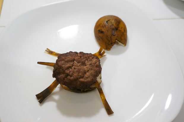 Coloque la carne en las piernas, tuve que recortar la hamburguesa porque eran demasiado grandes.