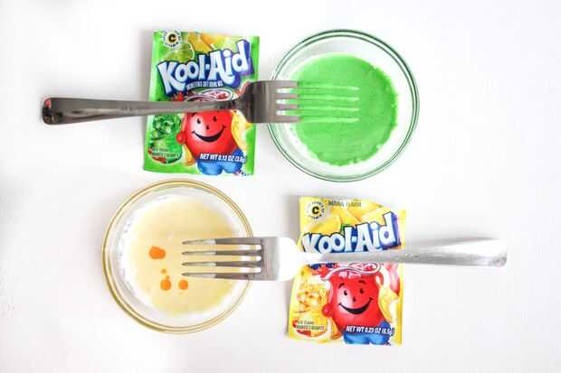 Tomar dos paquetes de Kool-Aid y viértalos en dos tazones de fuente pequeños. Añadir dos cucharadas de la crema de leche a cada taza y mezclar bien.
