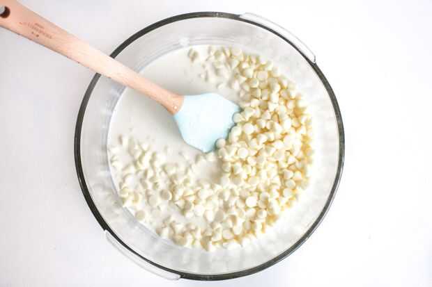 Ponga sus fichas de chocolate blanco en un tazón grande y verter la crema encima. Mezclar hasta que se combina totalmente.