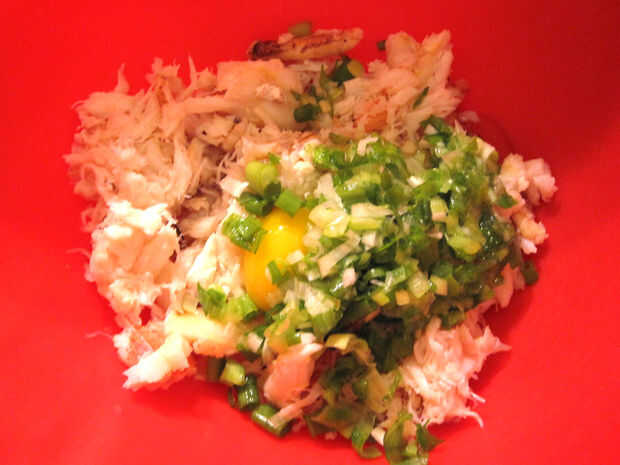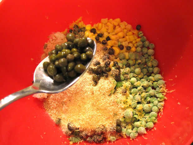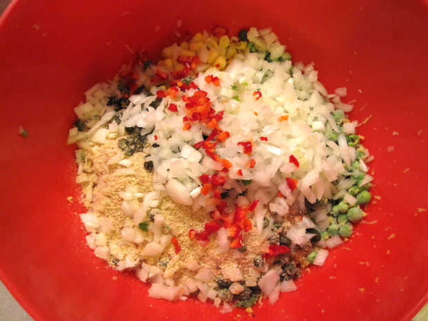 A continuación, agregue 1/4 taza de pan rallado, 1 huevo, 1 cucharada de alcaparras, 1/2 de una cebolla grande - picada finamente, 4 dientes de ajo picados, 1/3 de taza de arvejas, 1/3 de taza de maíz, y uno bien picado Pimienta de Chile caliente fresca.