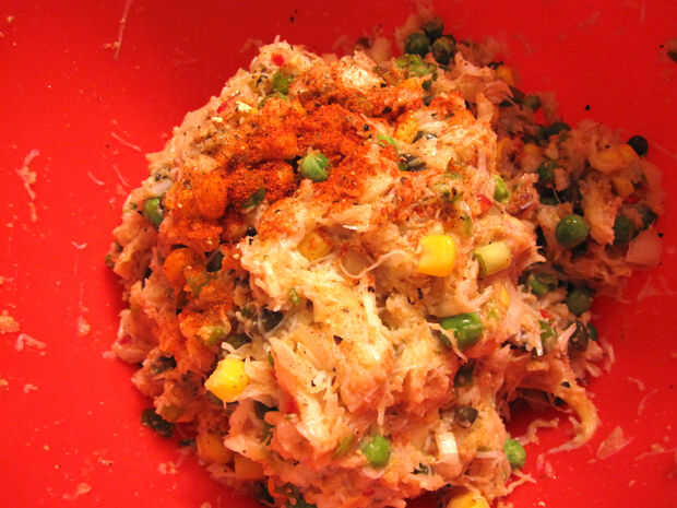 Mi versión de los pasteles de cangrejo se diseñan para ser pequeñas, dos o tres bocados de suave, crujiente por fuera y cálido y esponjoso en el interior. No tienen un fuerte sabor de cangrejo y siempre son un éxito en las fiestas y hacer un bocadill