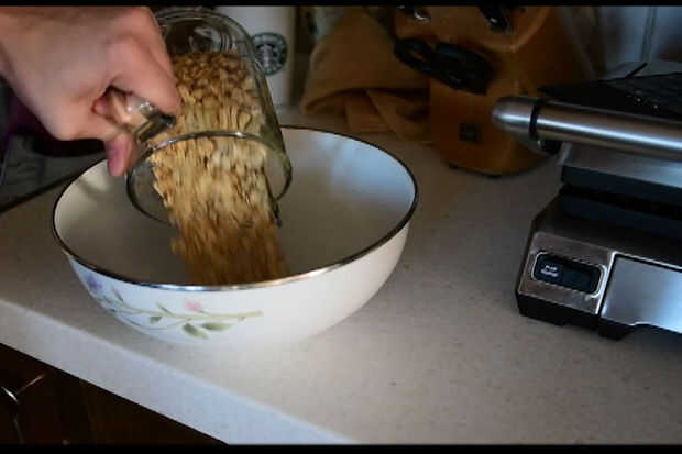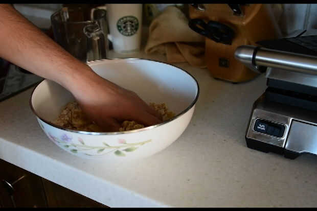 Mezclar los ingredientes en un bol, hasta que la masa es una consistencia uniforme. Si usted quisiera, ahora sería un buen momento para añadir las bayas o frutos secos para un sabor extra.