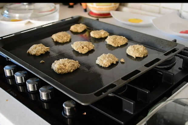 Receta de galletas de avena Chia desayuno:1 taza de avena1/2 taza harina2 TSP. polvo de hornear1/4 cucharadita sal1/2 taza salsa de manzana1/4 taza semillas de chía1 cucharadita de extracto de vainillatbsps. 2 mantequilla vegana, ablandada (yo usé el