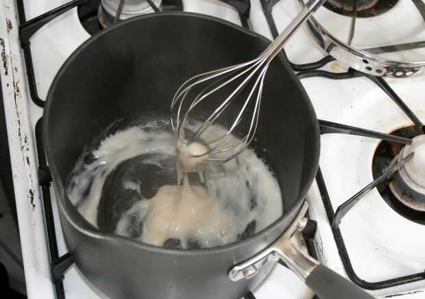Vierta la mezcla de arrurruz en una cacerola pequeña y cocine, removiendo con frecuencia a fuego medio hasta que la mezcla alcance un hervor todo. Será muy grueso y gomoso. Retire inmediatamente la cacerola de la estufa.