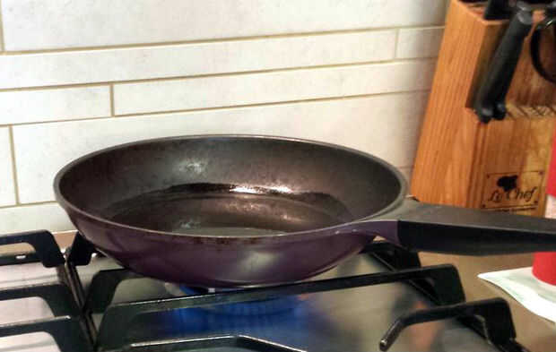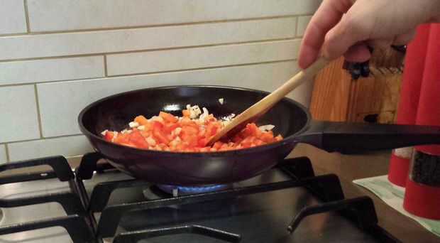 Vierta 1 cucharada de aceite de oliva en una sartén profunda y calentar para arriba. (usted puede verificar si la sartén está caliente lanzando un pedazo de cebolla, si la sartén está que suficientemente caliente la cebolla hará un ruido de "tssssss").