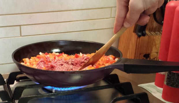 Añadir la carne picada y de ahora en adelante, presiónela contra la sartén para romperlo abajo (yo recomiendo hacer este paso con una cuchara de madera y no con otras herramientas).