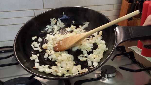 Cuando la sartén esté caliente añadir la cebolla y los dientes a él y mezclar hasta que se vuelvan de color marrón dorado.