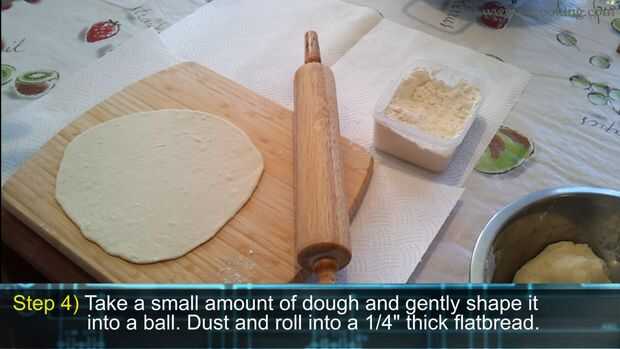 Paso 4) Tomar una pequeña cantidad de pasta y moldear suavemente en una bola. Polvo y rodillo en un flatbread de 1/4" de espesor
