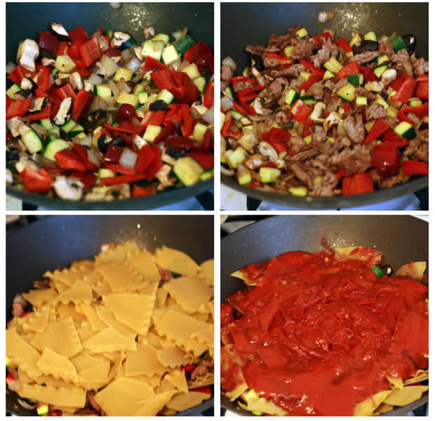 Superior a la carne y veg con las piezas de pasta sin cocer, roto y cubra con salsa de pasta y vino (si se usa).