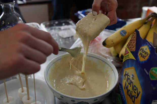 2. S ' Mores en la capa de mezcla: sumergir cada s ' More en su masa cubriéndola completamente.