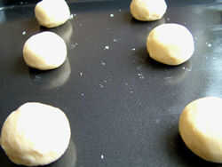Hacer tantas bolitas y colocarlas sobre una bandeja dejando espacios entre ellos. Aplane cada bola de la mezcla un poco con el dorso de una cuchara.