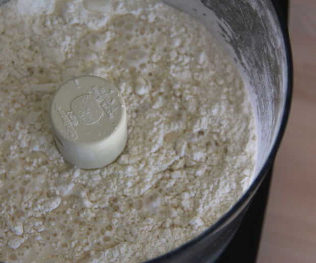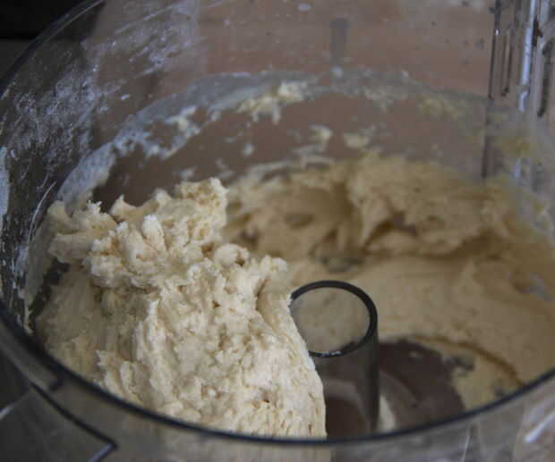Ahora, vierta la leche y pulso varias veces más. La mezcla debe empezar a la bola hacia arriba y alrededor en el procesador. Tan pronto como eso suceda estarás listo para ir al siguiente paso!