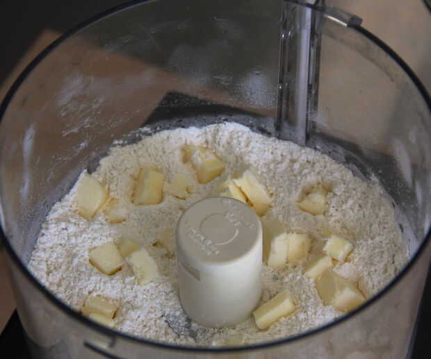 Toma la mantequilla de la nevera y cortar en trozos pequeños y ponerlo en el procesador. Ahora pulso 15 - 20 veces, o hasta que la mezcla sólo un poco granulada - no debería ver ningún grandes trozos de mantequilla. Asegúrese de que no oprime el botón mientras pulsar - pulsación demasiado causa la mantequilla a calentar encima de demasiado.