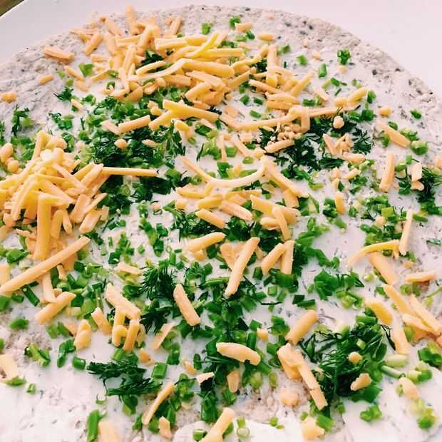 3. Distribuida uniformemente sobre 3-4 cucharadas de hierbas y queso de crema de ajo en la envoltura. Luego Espolvoree queso cheddar y cebollino picado, eneldo, hasta que la envoltura está cubierta uniformemente.