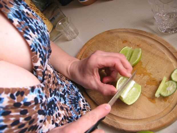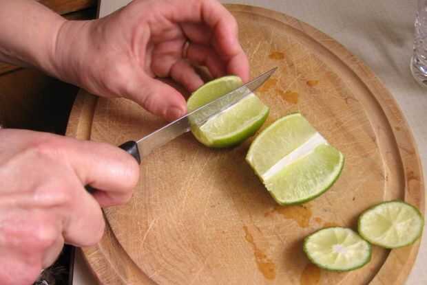Media las cales con un cuchillo y corte "V" del surco para eliminar la parte medulosa del centro de cada mitad. (No desea que ella/él para quejarse de que su copa está llena de médula!)