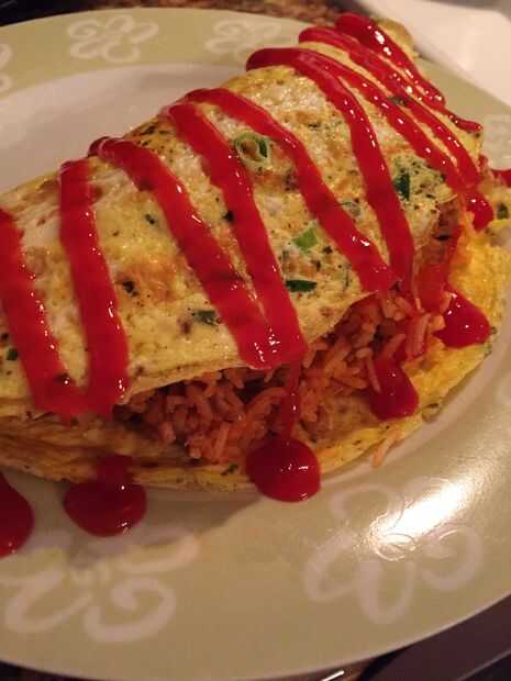 Materia el arroz en un lado de la tortilla y doblar la otra mitad encima. Proceder a la difusión de picante salsa de tomate sobre ella en un estilo zig-zag (o lo que quieras)