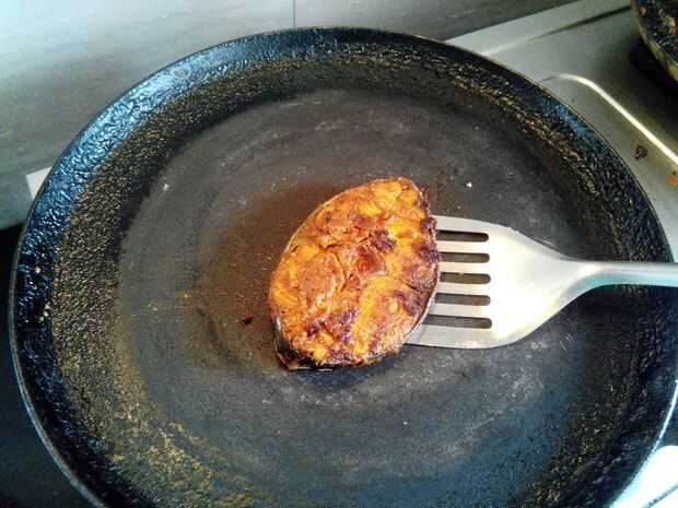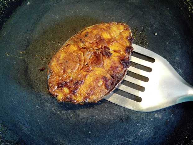 4.Heat pan(tawa) plana para con aceite hasta que esté muy caliente. El adobo para el pescado frito no deja el pescado si frito en sartén caliente. Ese es el truco. Someras freír el pescado durante 2 minutos por cada lado en el plano pan(tawa). Si desea freír puede freír el pescado en aceite caliente en una cacerola curvada.