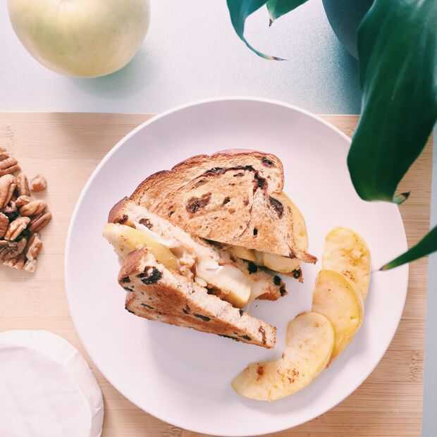 Si te gusta dulce queso de Brie con pan o galletas, sin duda te gustará este sándwich. Este no es el típico sandwich, es como un sándwich de "postre" porque contiene ingredientes dulces como las manzanas, canela, nueces, queso brie sobre una tostada de canela con pasas de uva. Se trata de una comida sana y sabrosa para hacer - ideal para la familia y para los vegetarianos también!