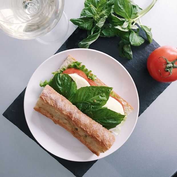 este delicioso sándwich relleno con ingredientes frescos es perfecto para días de verano.Ingredientes:1 Rodas Mini Baguette, cocido al horno siguiendo las instrucciones en el paqueteal pesto3 rebanadas de tomate fresco2 rodajas de mozzarella fresca3-