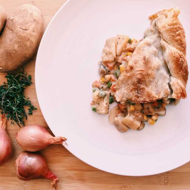 Seta de papa pastel. Cremoso con sabor profundo seta, lleno de bondad de patata y escamosa en el exterior. Se hace principalmente de patatas, verduras, zanahorias, guisantes, setas crema y tierra. Como sopa de setas cremosa con deliciosas verduras en una tarta de hojaldre. ¿Quién puede resistirse? Para más información sobre por qué esta receta es sin carne y cómo podemos todos ayuda detener el cambio climático, desplácese hacia abajo y lea a continuación.