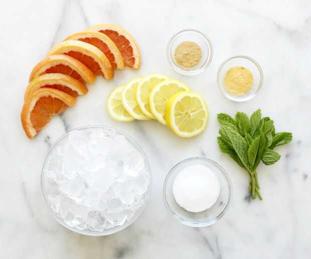 • en cuartos y rodajas de frutas cítricas y menta fresca para decorar