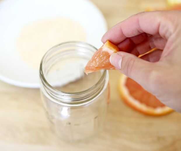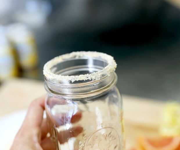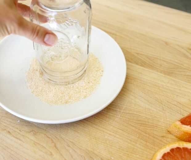 Luego use un pedazo del citrus para mojar el borde de las copas y presionar el borde del vaso en la sal / polvo *.
