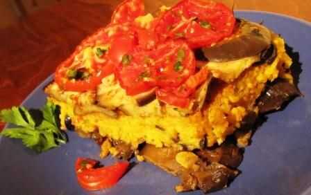 Verter el aceite restante en una cazuela y cubrir la superficie con ella. Poner una capa de berenjenas (aprox. mitad de la cantidad entera), poner poco de pimienta, el pimentón y la mitad de las rodajas de ajo. Ahora cubrir uniformemente el arroz y poner encima el resto de las berenjenas. Añadir pimiento/pimentón y el ajo restante.