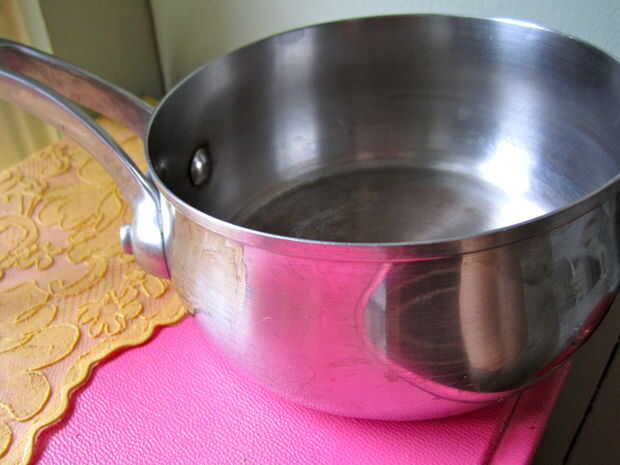 Agregar de 1/4 de taza de bicarbonato de sodio a un par de tazas de agua en su cacerola y poner a hervir en la estufa durante 5-10 minutos. Mientras que esto está pasando, ayuda a raspar el fondo de la olla con una cuchara de madera.