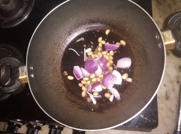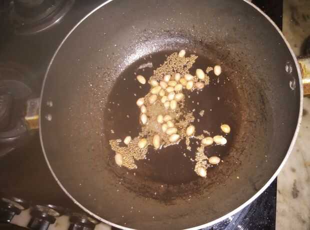 2. Vierta el aceite en sartén y añadir las semillas de mostaza, amarillo guisantes y cacahuetes.