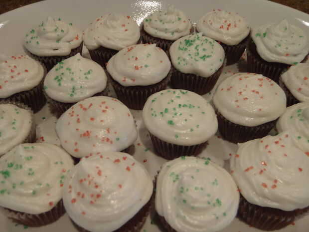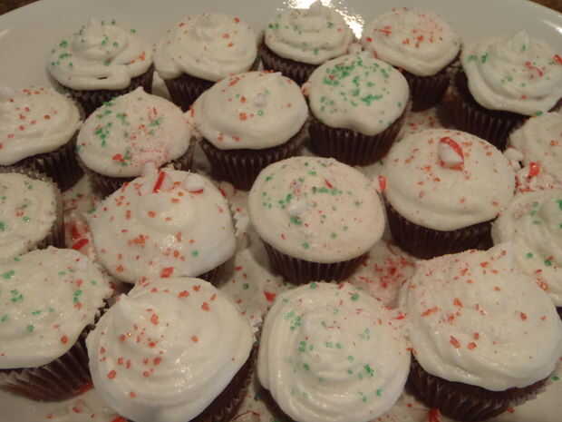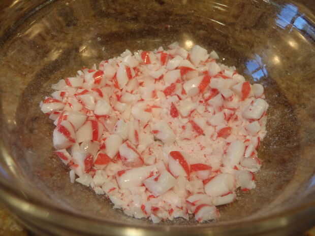 Pele el plástico de los bastones de caramelo mini y grueso aplastarlas. Puede utilizar una tabla de cortar, o un tazón de fuente. He probado la tabla de cortar y apenas volaban en todas direcciones, así que ponlos en un recipiente con bordes altos y utilice la parte posterior de un exprimidor de limón aplastarlo! Espolvorear el granillo en y un poco de bastón de caramelo sobre todos ellos.