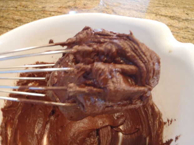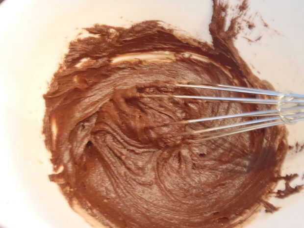 En un recipiente aparte, batir harina, polvo de cacao y la sal; Añadir a la mezcla de chocolate y batir para mezclar.