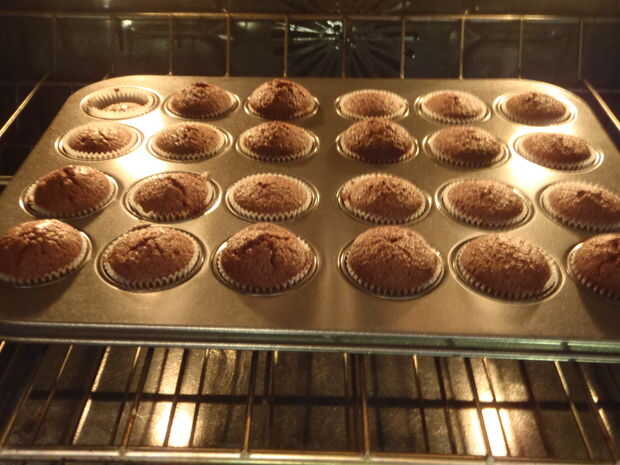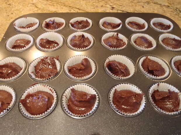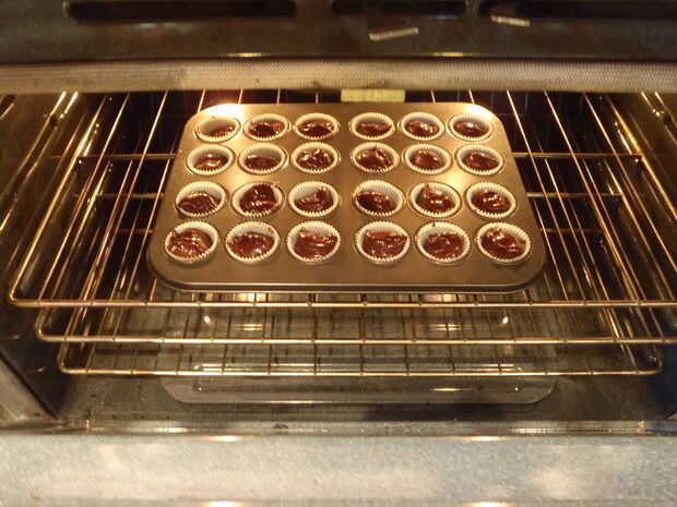 Cuchara por 1 cucharada sopera en panecillos preparados y dependiendo del tamaño de la cucharada, usted debe llenar la bandeja entera perfectamente, tuve uno que era mitad lleno, pero que está bien. Introducir en el horno a temperatura de 350° F (180° C) y dejar cocer durante unos 12 minutos. El número de minutos será diferente para hornos para mantienen un ojo sobre ellos. Cuando los brownies preparados, hacer el probador de horno con una selección de diente. Si sale mojado no listo. Si sale con húmedo migas de su lista!